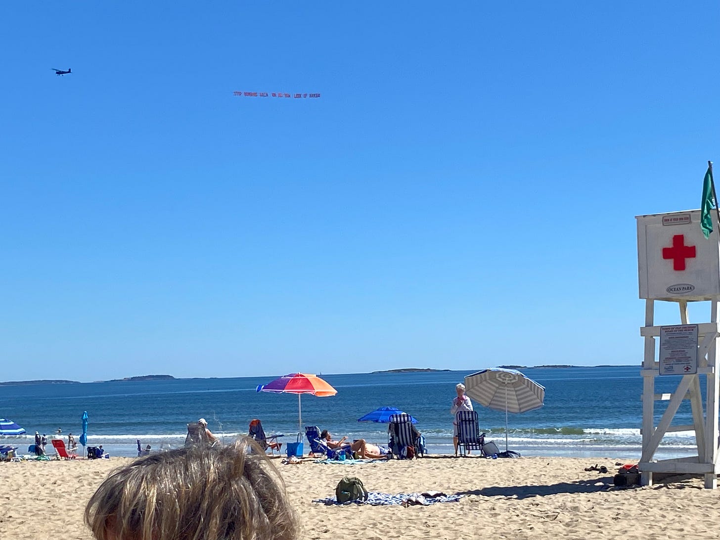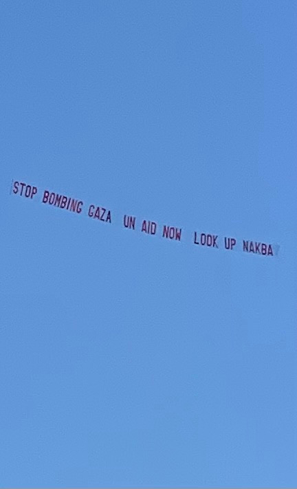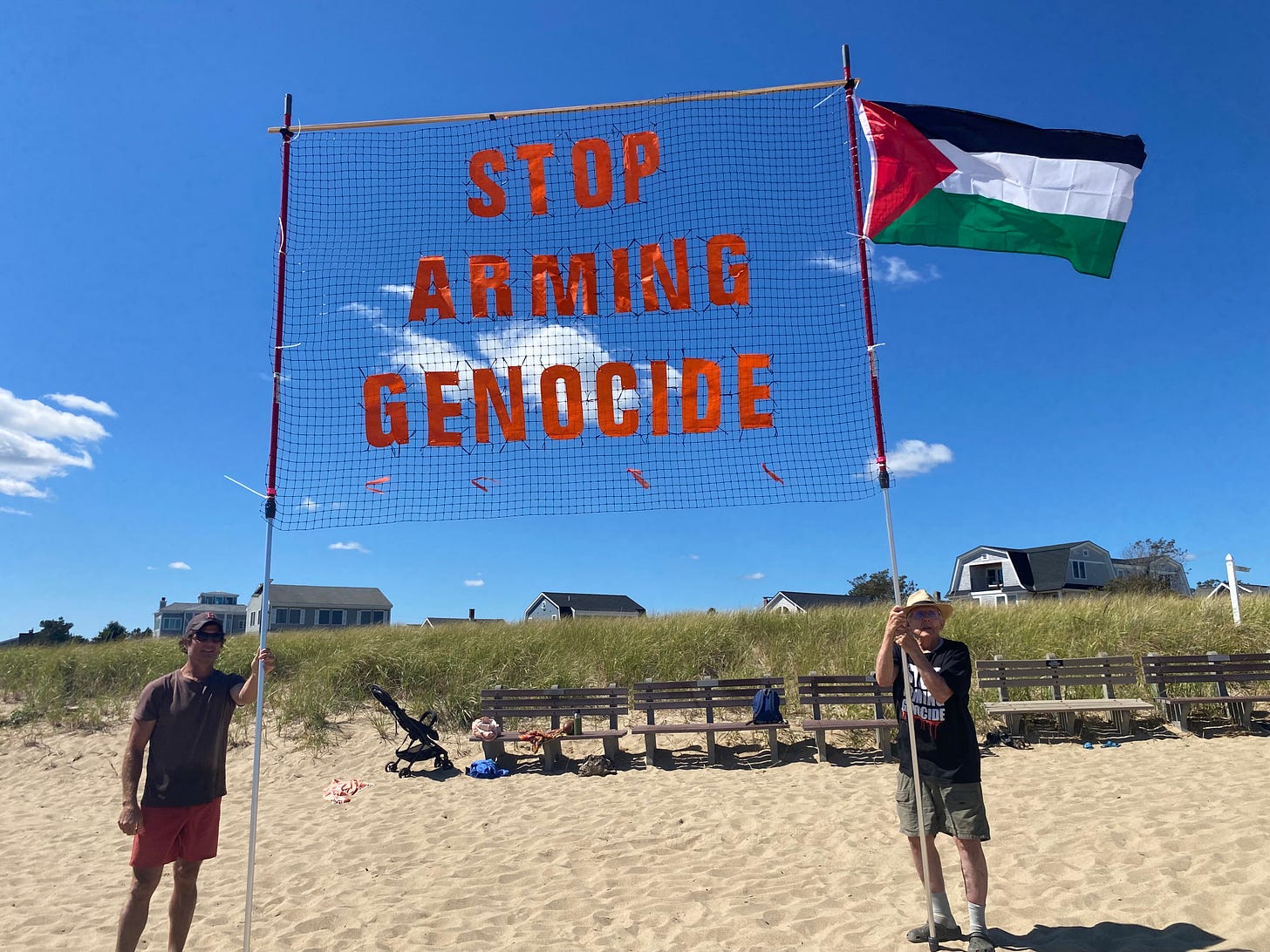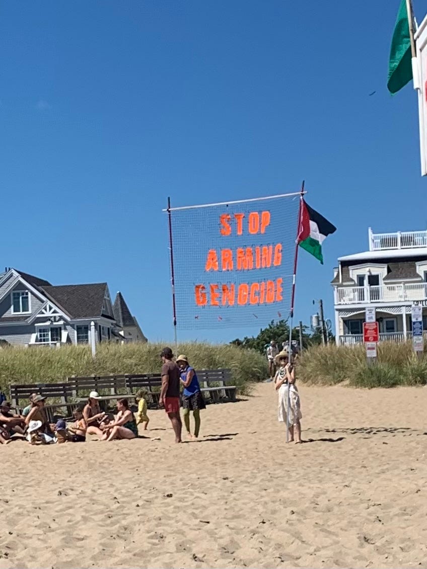 My friend Lynn Bradbury has spent Labor Day weekend at OOB with her extended family for decades. This year, with some trepidation about being the turd in the vacation punchbowl, she hired an airplane to fly around over the beach towing the message: STOP BOMBING GAZA UN AID NOW LOOK UP NAKBA. We joined her with our big STOP ARMING GENOCIDE banner and displayed it for a couple of hours while the plane flew overhead.