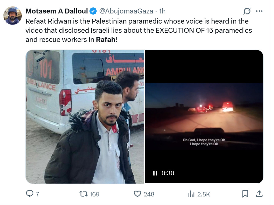 Live video emerged of Israel assassinating aid workers in Gaza. Following the executions Israel lied about them attacking the occupation troops and/or not being clearly identified as aid workers. As reported by Sky News: